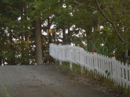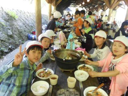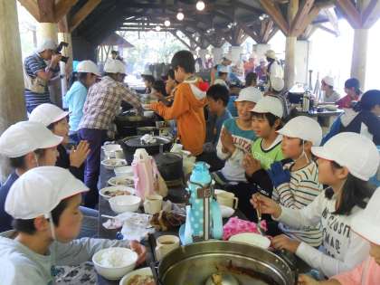 グループごとにおいしくいただき、みんな満足そうな顔でした。後始末もごしごしとしっかりお鍋も洗い、気持ちよくかたづけができました。そんなときに野生のたぬきが近くまできていました。
