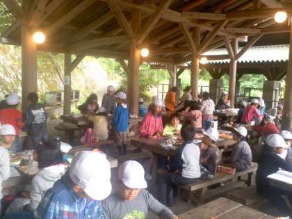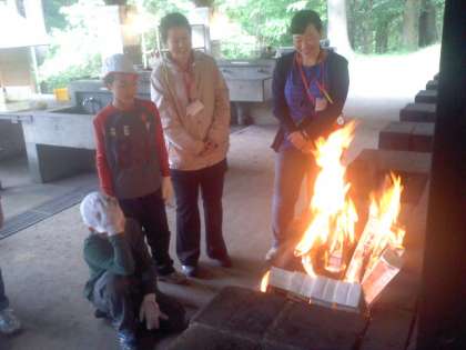 朝ごはんはパックドッグです。パンに材料をはさんでアルミホイルでくるんでから牛乳パックに入れて火をつけます。おいしく食べられましたね。