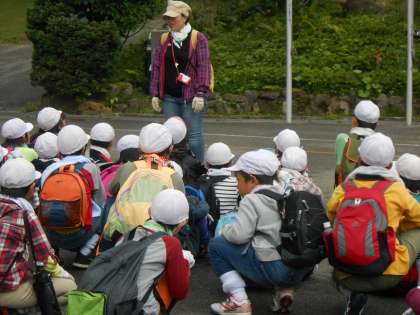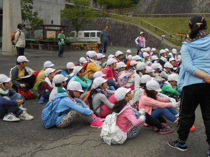朝のつどいでぱらっと雨に降られましたが、そのあとは降らずに登山に出発していきました。朝から準備運動もしてバッチリです。