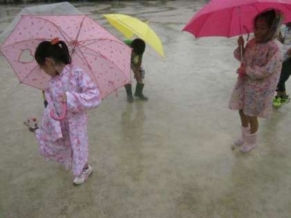 普段は避けて通るような水たまりに入って雨の音を聞くなど,いつもと違う運動場で楽しそうに雨探検をしていました。