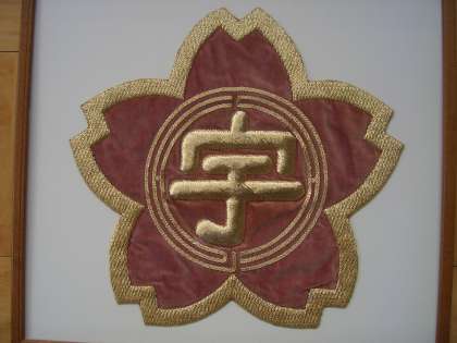 校区が有名な桜の名勝地であることにちなんで、外形をサクラ形にし、その中に校名の頭文字「宇」を囲んで「多」と「の」を三重円に構成してまとめたものです。校歌とともに昭和49年に制定されました。