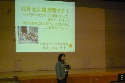 12月1日に朝会を行いました。校長先生から人権のお話がありました。日本と外国の生活の仕方のちがいにふれ,そのようなちがいを認め合い,自分の考えに生かすことで考えが広がり豊かになるというお話でした。ふだん自分と友達の考えや行動がちがうことがありますが,それが相手に意地悪をする理由にはなりません。ちがいを認め合うことができるといいですね。また,校長先生と作家のあまんきみこさんとの対談のお話も聞きました。あまんきみこさんから子どもたちへのメッセージが紹介されました。