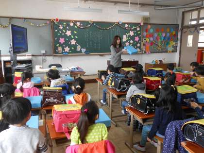 朝、1年生はやっと着いたと言いながら、学校の坂をあがってきました。優しいお兄さんやお姉さんがお道具箱の袋を持ってあげている子もいました。各教室の様子です。