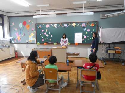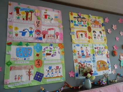 おおぞらでは朝の会をしていました。1年生の後ろの壁面もすばらしいです。