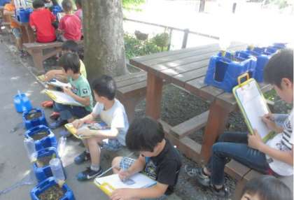 子どもたちは,ホウセンカの芽の色や形,大きさなどの特徴に注目して,それぞれ観察カードにかいていきました。