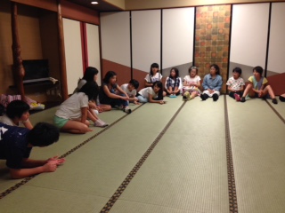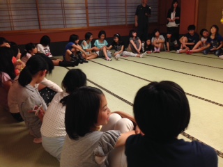 男子がお風呂に入っている間に女の子だけで集まってレクリエーションをしています。まずは、しりとりから。