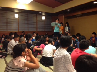 寝る前にグループで集まりミーティングをしました。そのあと、全体発表でリーダーが一人ずつ今日のめあてについて話してくれました。楽しむだけでなく、明日がんばることも考えられました。