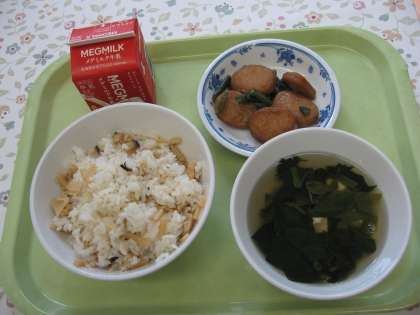 今日は季節のたけのこご飯、平天の煮付け、すまし汁、牛乳です。
