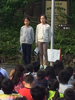 お待たせしました。山の家から写真が届きました。朱雀第七小学校との朝の集いの様子です。はきはきと学校紹介ができました。