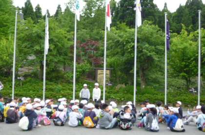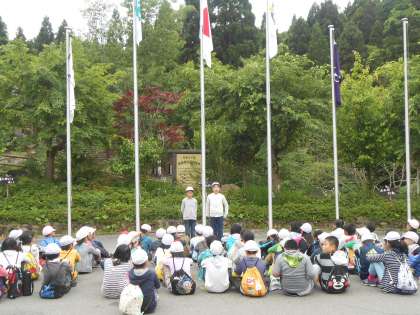 片づけを時間内にすまし、朝のつどいに集まってきました。最後の1日、しっかり山の家の職員さんやほかの学校の先生や子ども達にもあいさつをして気持ちのいい一日にしようと話をしました。
