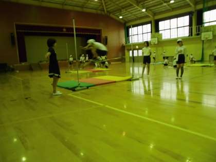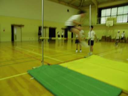 6年生の体育の授業では,「高跳び」の学習をしています。リズミカルに助走して,はさみ跳びで跳ぶ練習をしています。自分の記録を更新することを楽しみながら学習を進めています。