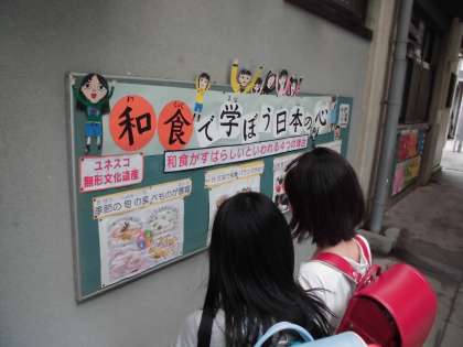 今月から給食で和食の日「和(なごみ)こんだて」が登場します。給食室横の掲示板に和食についての紹介がされています。第1回目の「和こんだて」の日は,来週16日(火)です。