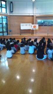 朝のつどいです。大原野小学校の皆さんと一緒です。大きな声で、校歌をうたったり、学校紹介などをしました。素晴らしかったです。
