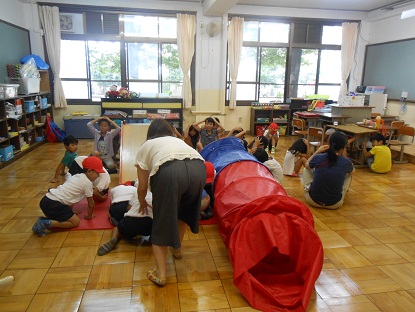 8月31日に中間休み想定の避難訓練を行いました。それぞれ、遊んでいた場面で頭を守り、物が倒れてこない場所に避難する訓練を行いました。