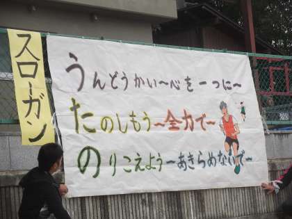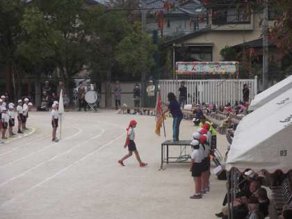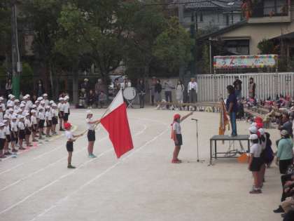 昨年度優勝の赤組から優勝旗の返還のあと,校長先生のお話,運動会のスローガンの発表がありました。