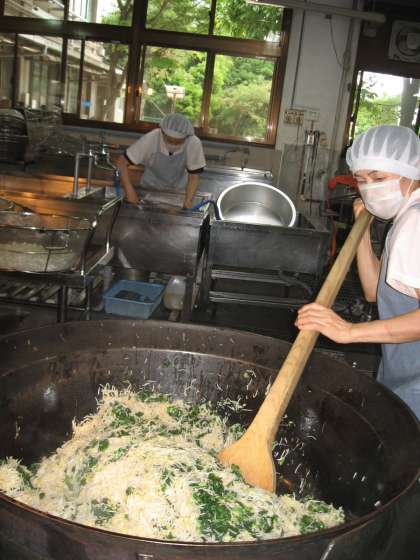 野菜は玉ねぎ,干ししいたけ,チンゲン菜が入っています。干ししいたけのもどし汁も使っているので,これもうま味のポイントです。
