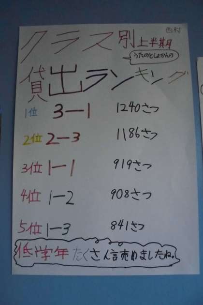 今年半期の貸出ランキングを掲示しました。人気図書や貸出冊数の多かった人,クラス別ランキングなどです。後期のはげみにしてください。