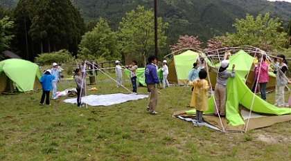 今夜はテントで泊まるので,その寝床をグループで協力しながらつくっています。