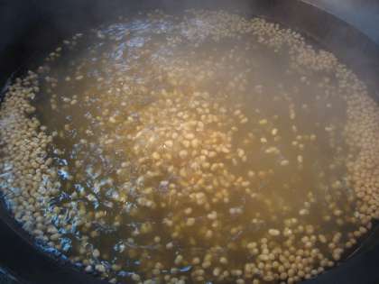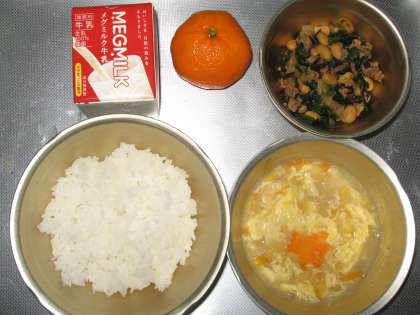6月11日(金)の給食は「肉みそ炒め」でした。名前からいうとお肉たっぷりの献立というイメージですが、この日は豚肉も入っていますが、大豆を乾燥で15g使っています。その大豆を大きななべで茹でて軟らかくしたものを肉や野菜といっしょに炒めてみそ、しょうゆ、コチジャンなどで味付けしています。ごはんにはよく合う味ですが、大豆を茹でると量もかなり増えて、子ども達からも「肉みそ炒め」ではなく「豆みそ炒め」だという感想がありました。もう一品の「中華コーンスープ」はいつものように大好評でした。デザートの冷凍みかんも暑い日だったので、「冷たい!冷たい!」と言いながら食べていました。