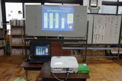 司書教諭・学級担任・学校司書の3名が授業に入りました。子どもたちは自分の出席番号と同じ数字のうってある辞典を使います。(あらかじめ司書がナンバリングしておく)
