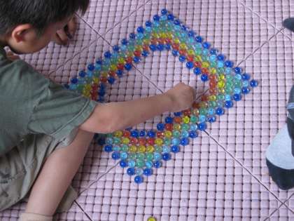 1つのグループで使えるビー玉の数は400個。なかなか並べ応えのある数です。子どもたちはビー玉をもらうと目を輝かせながら転がしたり光に透かしたりしながら思い思いにビー玉と触れ合っていました。ビー玉は色とりどりにキラキラしていて,それを見る子ども達の目もキラキラ輝いて見えます。