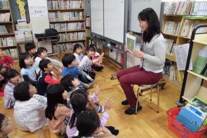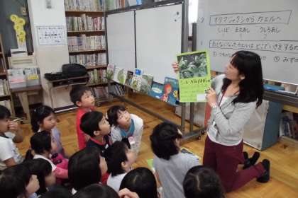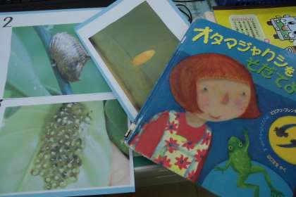 学校司書より,生きもののたまごクイズからはじまりました。子どもたちはモンシロチョウ・カマキリ・カエルのたまごを写真で見てから,「オタマジャクシをそだてよう」(ビビアン・フレンチぶん)を読みました。そのあと,本にでてきた内容について(たまごのかえる日数や足の生える順など)クイズ形式で確認しました。