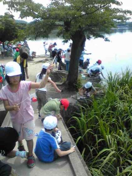 バスに乗って広沢の池まで,ざりがにつりにいきました。子ども達は,するめやにぼし等をえさにして,釣りを楽しみました。子ども達は,すぐに釣れるかと思っていたようですが,難しくなかなか釣れませんでした。