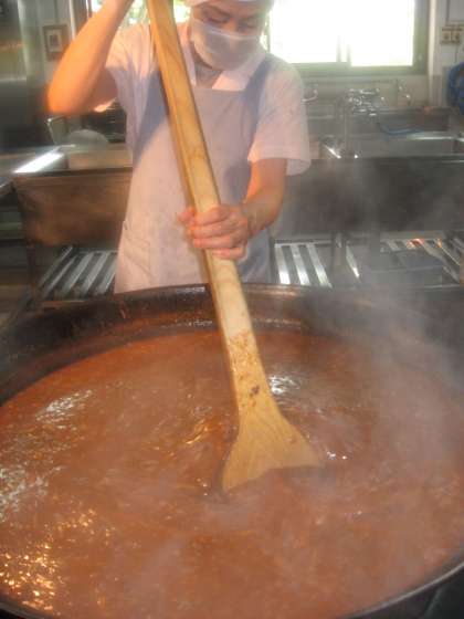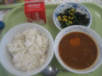 今日の給食は「ハッシュドビーフ」と「ほうれん草のソティ」です。