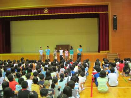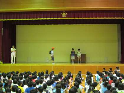 始めに計画委員さんが,朝のあいさつをしよう!というテーマで,「よいあいさつ」と「よくないあいさつ」例を劇で見せてくれました。見ていた子ども達からは「そら,あかんよねえ。」とか「あ,ちゃんとあいさつしはった。」など,自分を振り返りながらのコメントが聞こえてきました。