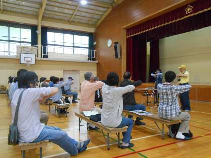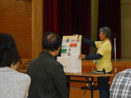 紙芝居を使っての交通安全のお話を聞いたあと、すこやか体操をしたり、体力測定が行われました。
