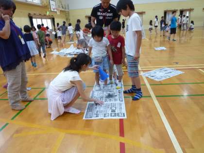 写真は、体育館の問題「みんなで協力して新聞を敷き、その上を1・2年生がわたっていこう!」に取り組んでいる様子です。