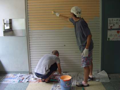 学校では廊下のペンキ塗りに教職員で取り組んでいます。明日も残りをします。