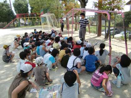 新聞紙を広くつなげて,運動場で遊具を包んでいくという活動です。