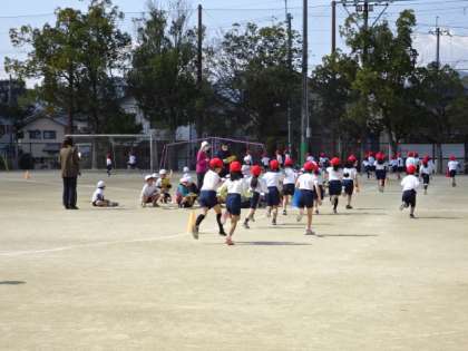 各学年で体育で取り組んだ持久走のまとめとして,持久走大会を行いました。写真は1年生です。ペアで記録を取りながら,がんばって走っています。