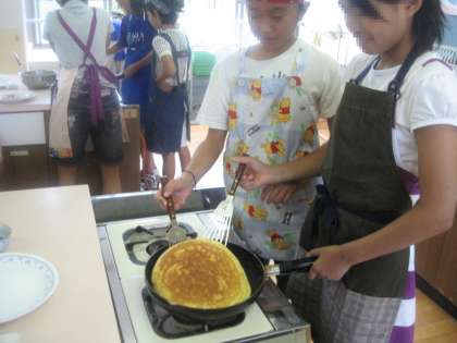9月27日の6校時はクラブ活動の時間です。料理クラブでは、ホットケーキを作りました。5つの班ごとに役割を決め、どんな形にするかなど話し合ってから作ります。1枚の大きなホットケーキにしたり、小さく何枚も焼いて3段に重ねたり、それぞれオリジナルのホットケーキができました。どの班もとっても満足して試食していました。