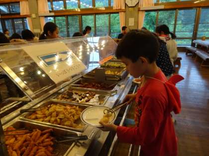 今夜はバイキングです。雲取山にも登り,元気な子はそのあとの自由時間でディスクゴルフをして遊びました。