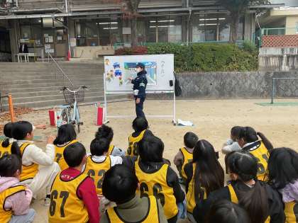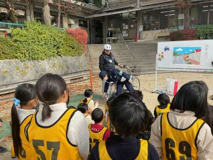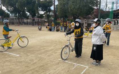 自転車教室での警察の方からのお話では、安全ノートで学習した内容のさらに深いことを教えていただきました。テスト走行では、「緊張する〜!」と言いながらも、安全に気をつけ自転車に乗ることができました。