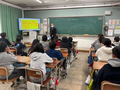出前授業ウィーク最後は警察のOBの方をお招きしての“非行防止教室”です。元警察の方からというだけで背筋が伸びそうですが、具体的な事例をもとに『いけないことはいけない』と正しい判断ができるようにという話でした。今日の学びをこれからの生活の中で生かしていってほしいと思います。