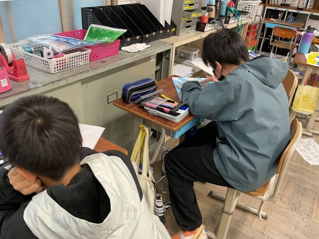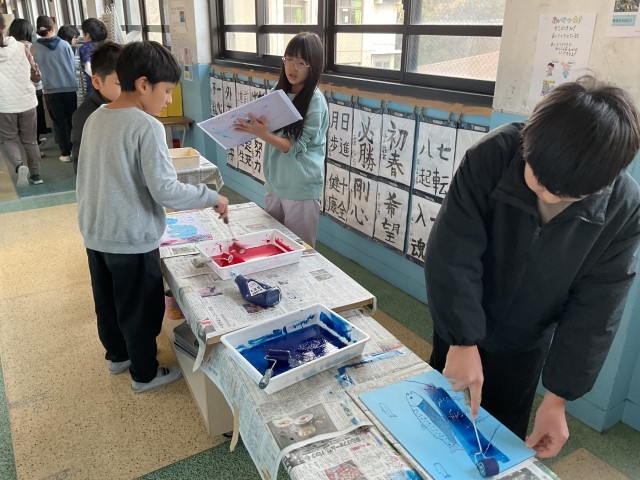 図工の『彫り進めて刷り重ねて』の題材で木版画に取り組みました。今回のテーマは『生き物とその世界』にしました。まずは線彫りで1回目の色で刷り、次は色を重ねたくない部分を面彫りして2回目を刷ります。さらに色を重ねたい子はさらに面彫りをして次の色を刷り重ねます。色を重ねることで色が変わっていって作品が仕上がっていくのを楽しみながらできました。参観の際に教室に掲示しますのでお楽しみに。