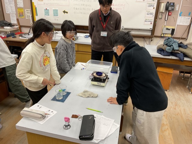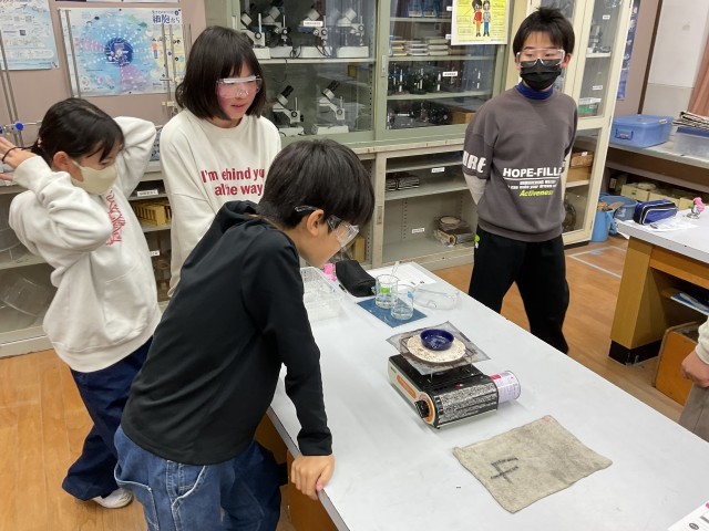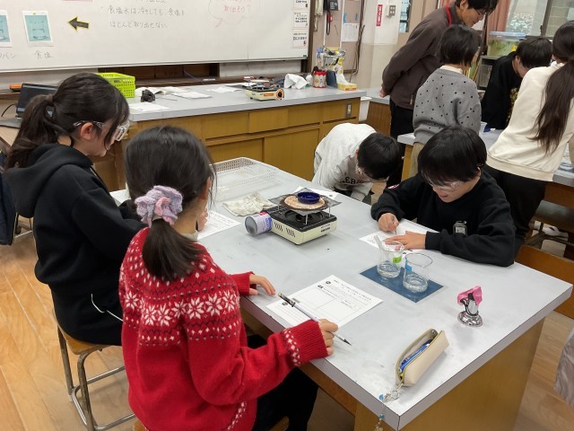 理科の『もののとけ方』の単元で、水に溶けた食塩やミョウバンを取り出す実験をしました。とけ残りのあるミョウバンはろ過をすることで取り出せ、さらに冷やすことでさらにとけ残りが出てきてろ過をすることで取り出せました。しかし、同じ方法では食塩は取り出せなかったので食塩は水をなくすことで取り出せるのではと考え、蒸発皿で食塩水を蒸発させるとお皿の上に白い粉が残りました。見えなかったものが突如現れ、意外とたくさんとけていたことが分かり驚いていました。この驚きが理科の楽しみの1つだなと思います。