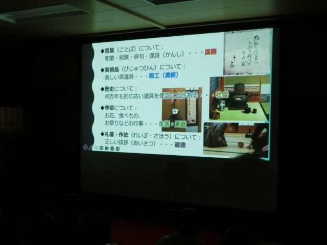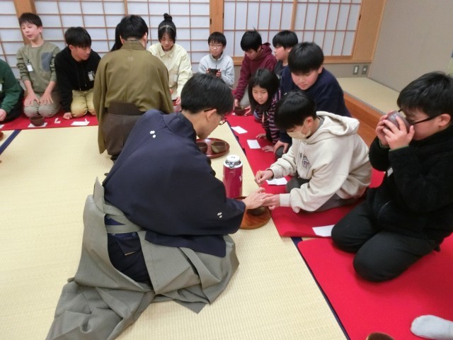 木曜日に武者小路千家の芳野敬弥先生に来ていただき、茶道について教えていただきました。茶道の歴史、楽しみ方などを聞き、子どもたちも興味津々でした。茶道を学ぶことで、たくさんの分野(国語、図工、家庭科、道徳など)に触れられることを知り、茶道が長年大切にされてきた理由にも触れることができました。お菓子を楽しみ、お茶を楽しみ、そして、お茶の入れ方を学んだ子どもたちは、「家でもやってみたい。」と今後も茶道を楽しみたい様子でした。ぜび、おうちの方も一緒に茶道に親しんでみてください。