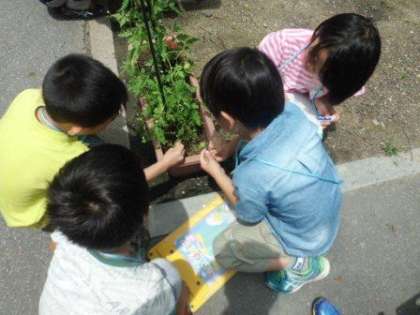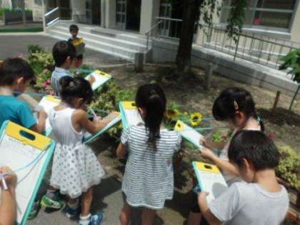 育てているあさがお,ひまわり,ふうせんかずらの観察をしました。花が咲いていたので,それぞれを見比べました。「ひまわりの花は黄色いね。」「ぼくの手を広げたくらいの大きさだったよ。」など,それぞれが気づいたことをかいていました。