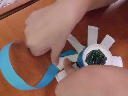 好きな色を塗ったり飾りをつけたりして,自分だけの回るおもちゃを作りました。羽をしっかりと折って,回りやすくしています。