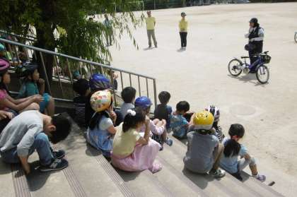 はじめに,自転車の点検の仕方・やヘルメットのかぶり方・正しい自転車の乗り方について教えていただきました。