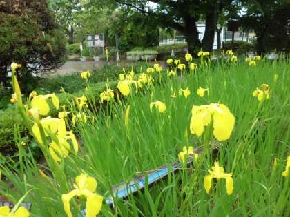 元気に登校してくる子どもたちをダイアモンド池のアイリスが迎えています。