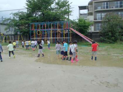 長靴で楽しそうに水たまりに入っていく1年生でした。