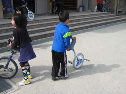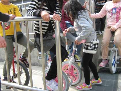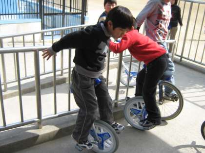 保護者や地域のみなさんがこつこつと集めてくださったベルマークで,一輪車を20台も新調していただきました。新しい一輪車にさっそくまたがった子どもたちは,「すごく乗りやすい!」「いっぱい練習したくなってきた!」と大喜びです。みんなが楽しく安全に使うことができるよう,ルールをしっかり守って使わせていただきます。