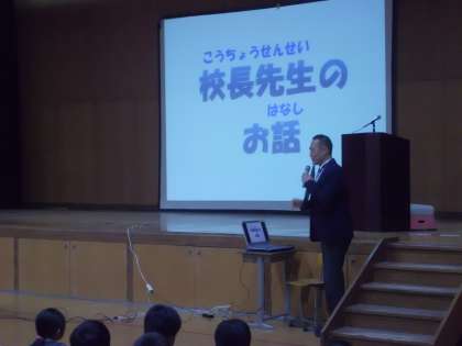 写真は,校長先生のお話と各クラスの友だちの標語発表の様子です。