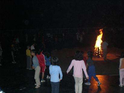 写真中…キャンプファイヤー。みんなでゲームやダンスを楽しみました。(1日目)