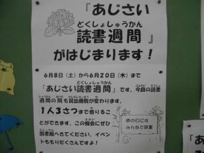 6月8日から6月20日まで「あじさい読書週間」」を行います。一人3冊まで借りることができます。またそのほかにもいろいろな読書イベントももりだくさん企画されています。